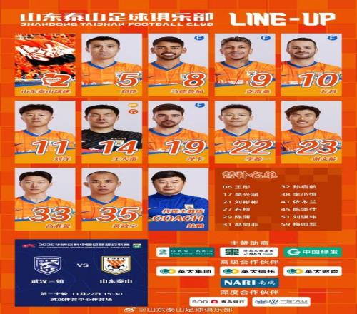 11月22日下午,泰山將在中超最后一輪對陣武漢隊,目前雙方首發(fā)陣容已經(jīng)出爐,韓鵬派出了全部主力,力爭幫助瓦科穿上本賽季金靴。