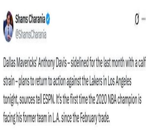 濃眉自10月30日起便一直缺陣,最初他將復出日期定在11月9日客場對陣華盛頓奇才隊的比賽。然而,獨行俠隊老板杜蒙特擱置了這一計劃——他聽從了達拉斯隊健康與表現主管比爾茲伯勒的建議,堅持認為除非有醫療數據表明濃眉不存在小腿拉傷加重的風險,否則不會批準其參賽。在周四的訓練結束后,濃眉向記者表示,他將在獨行俠隊周末背靠背對陣兩支洛杉磯球隊(湖人與快船)的其中一場比賽中登場。