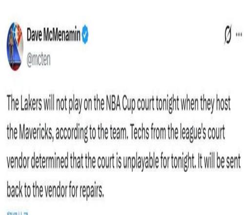 另外,湖人官方宣布,由于球隊NBA杯特制地板出現質量問題,今日主場對陣獨行俠的NBA杯將用常規的地板來進行比賽。據悉,聯賽地板供應商的技術人員確定,今晚的比賽地板無法使用,地板將被送回供應商進行維修。